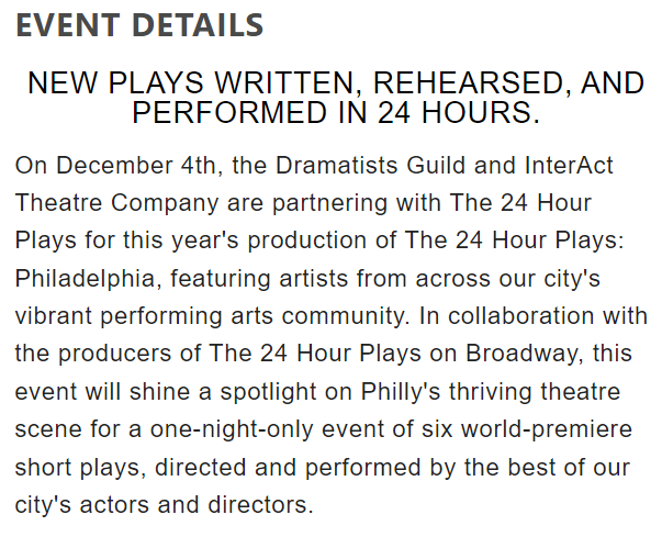 November 28, 2023 See Me in The 24 Hour Plays December 4th @ The Drake! Grab your ticket here! Share this: Click to share on Facebook (Opens in new window) Facebook Click to share on LinkedIn (Opens in new window) LinkedIn Click to share on Threads (Opens in new window) Threads Click to share on Bluesky (Opens in new window) Bluesky Related